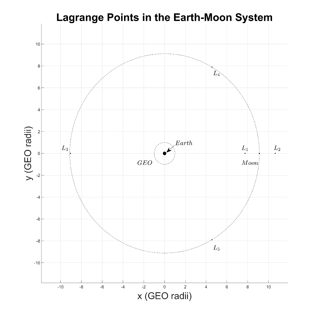 Figure 1-3: The fixed frame and Lagrange points of the Earth-Moon system cislunar relative motion reference frame in terms of GEO radii instead of normalized units with Earth at the center.