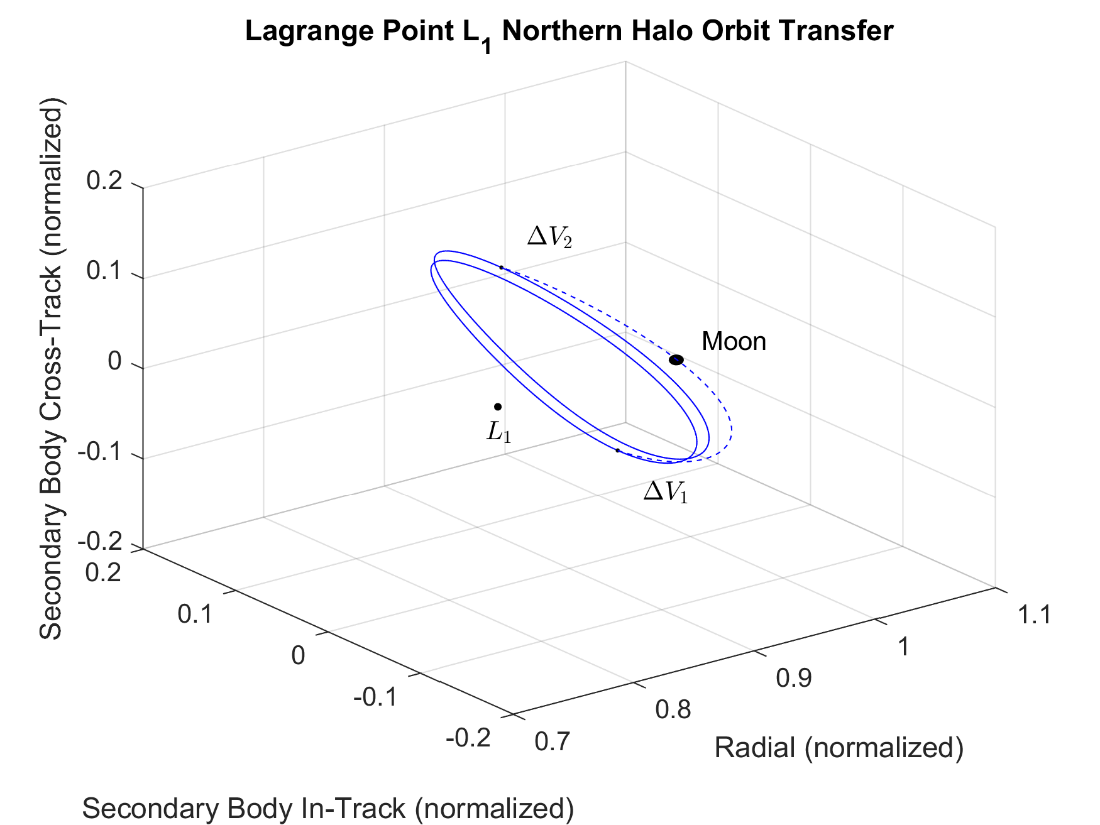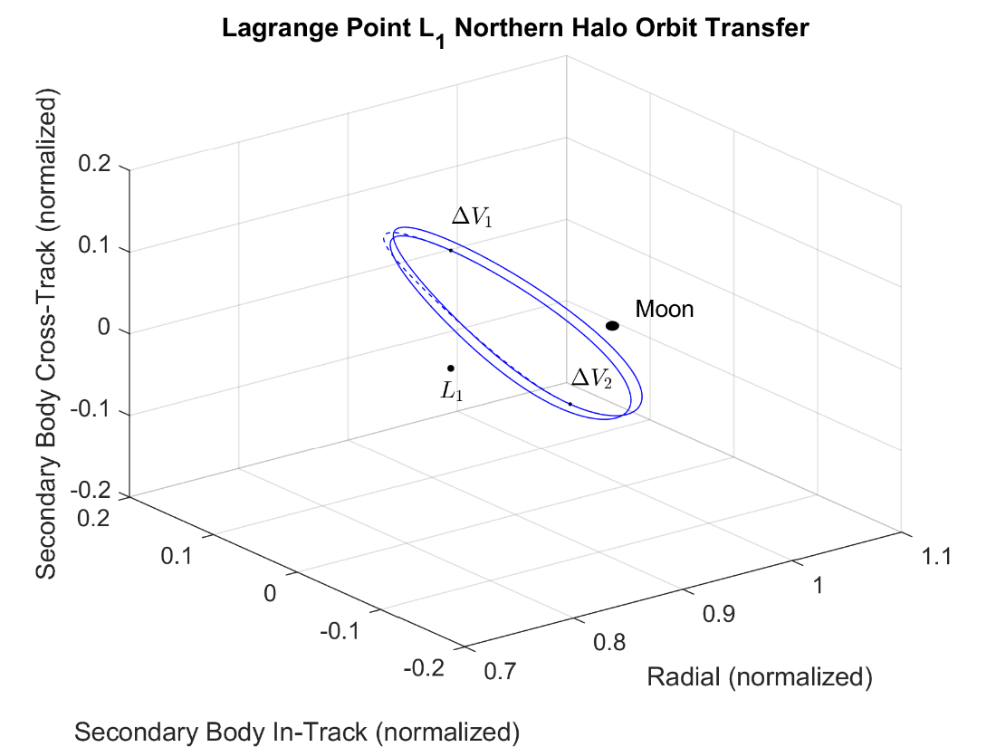 Below shows an example northern halo orbit transfer from an orbit with an apogee of 0.940 to an orbit with an apogee of 0.950. When transferring from one northern halo periodic orbit to another, there are several burn options available such as conducting an initial burn at perigee of the initial orbit and a final burn at apogee to enter the final orbit or conducting an initial burn at apogee of the initial orbit and a final burn at apogee to enter the final orbit.