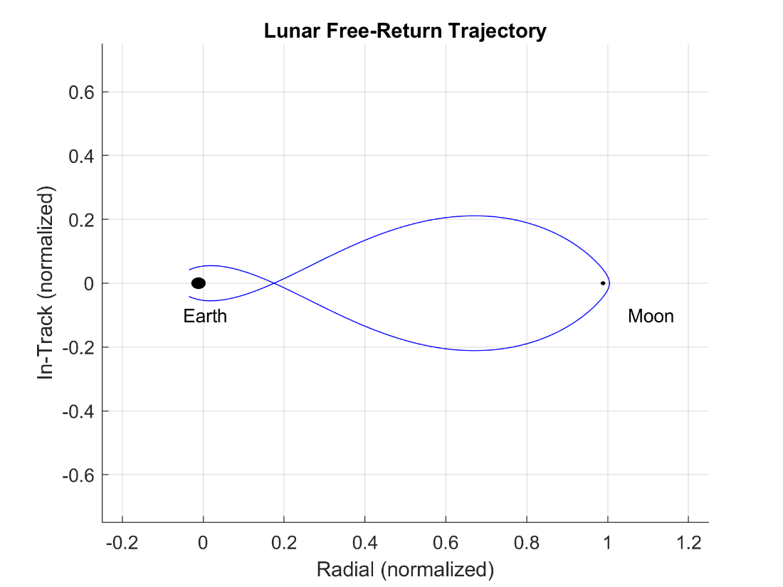 Figure 12-1: An example of a lunar free-return trajectory in the rotating synodic frame.