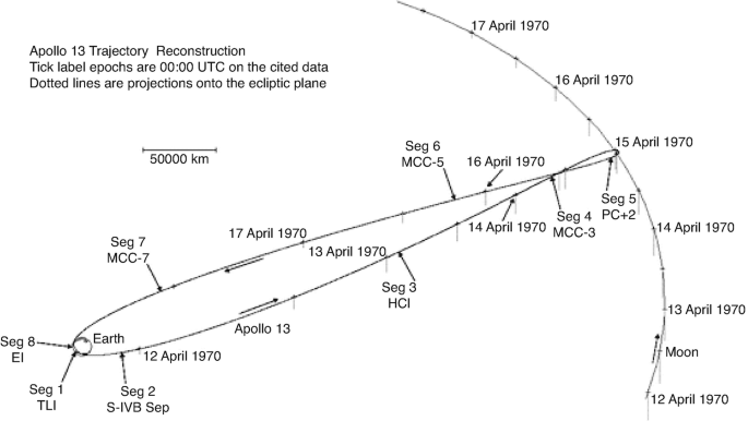 Figure 12-2: The lunar free-return trajectory of the Apollo 13 mission.