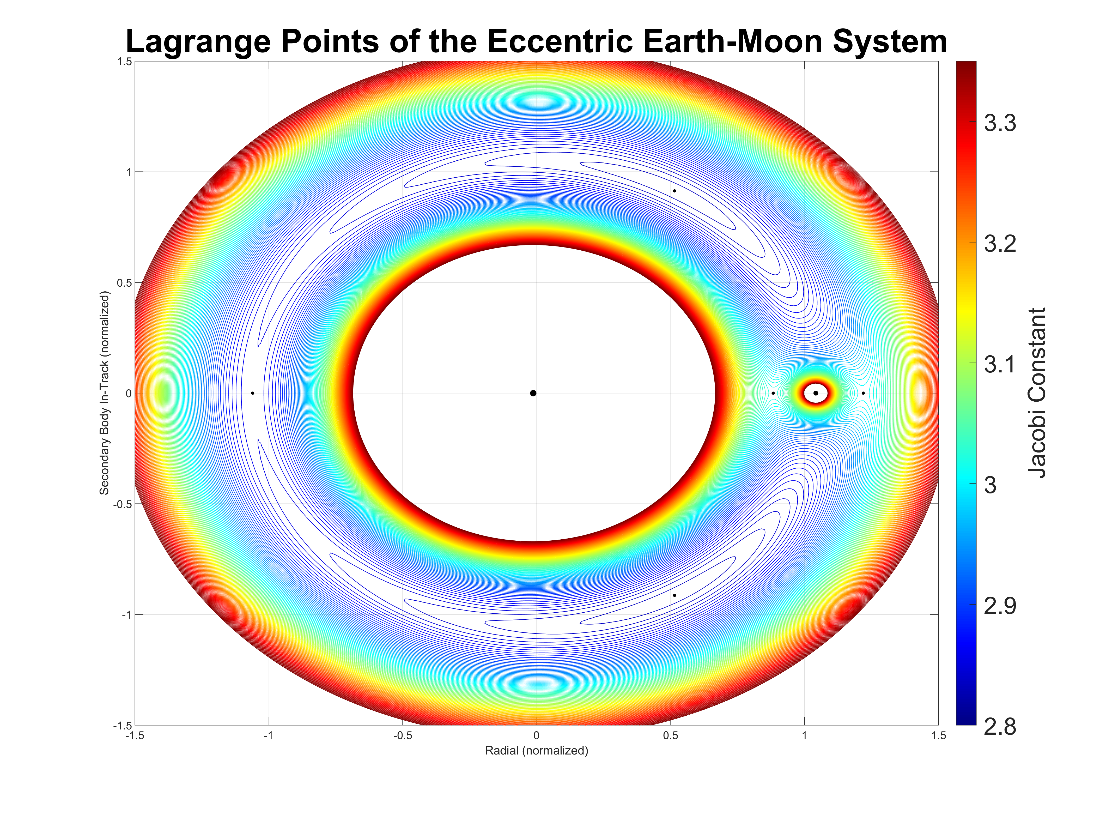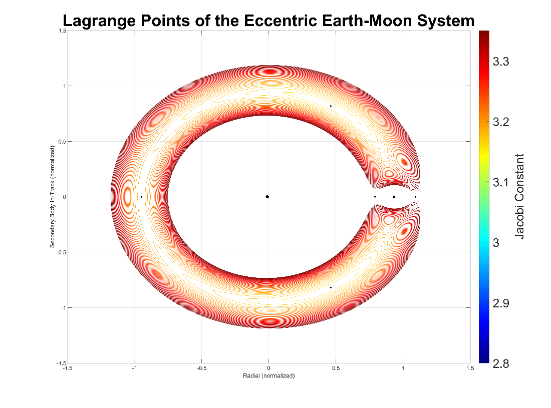 Figure 3-2 below shows the Earth-Moon rotating synodic system where the rotating frame stays fixed on the Moon as it orbits Earth in an eccentric orbit. The Lagrange points follow the stable valley points of L4 and L5, as well as the unstable saddle points of L1, L2, and L3.