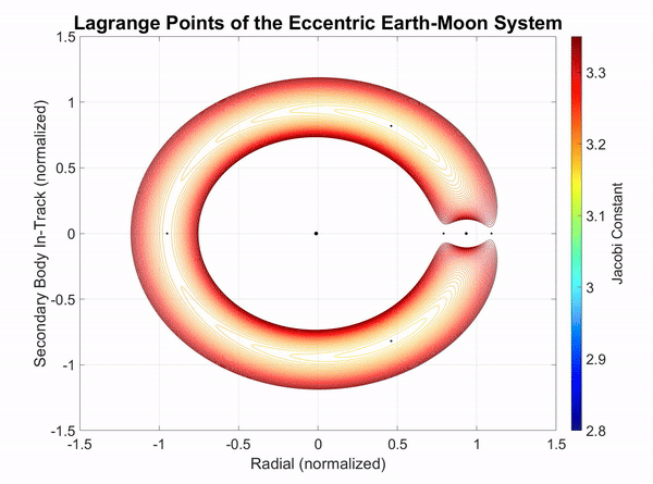 Since the Jacobi constant contour ebbs and flows, the two extremes when the Moon is at perigee and apogee can be viewed separately to visualize the difference as shown in Figure 3-3 and Figure 3-4. In these figures, the mean motion of the reference frame is that of the average distance to the Moon of 384,400 km.