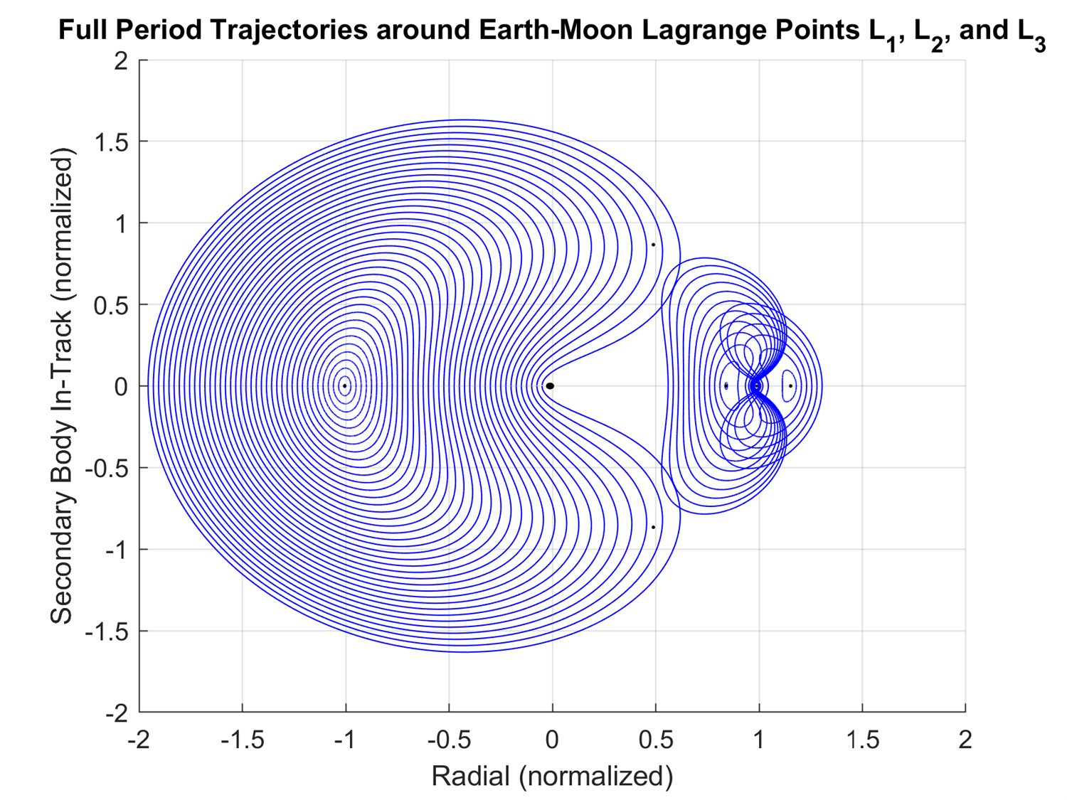Figure 7-2: All planar trajectories for Lagrange points L1, L2, L2.