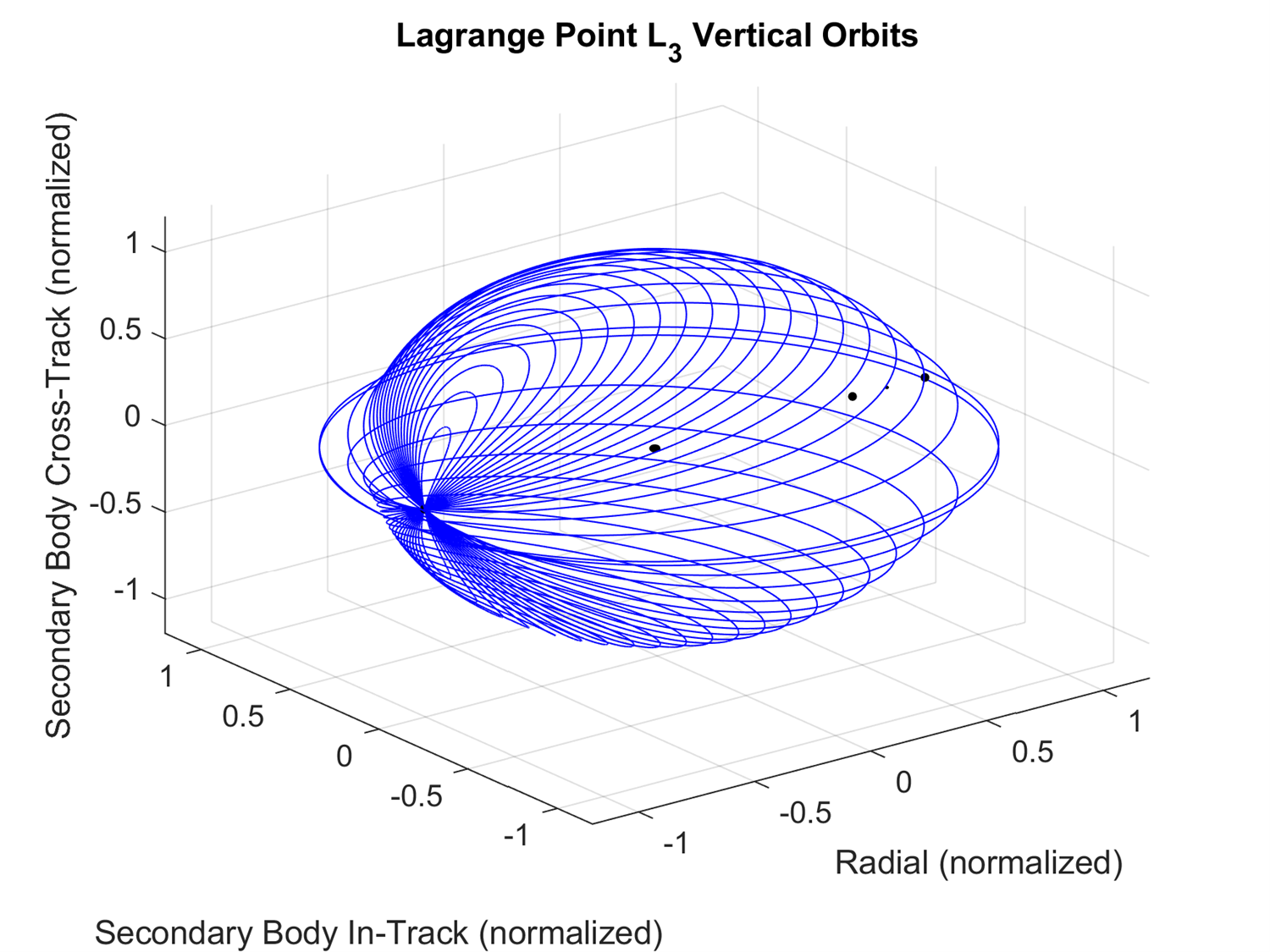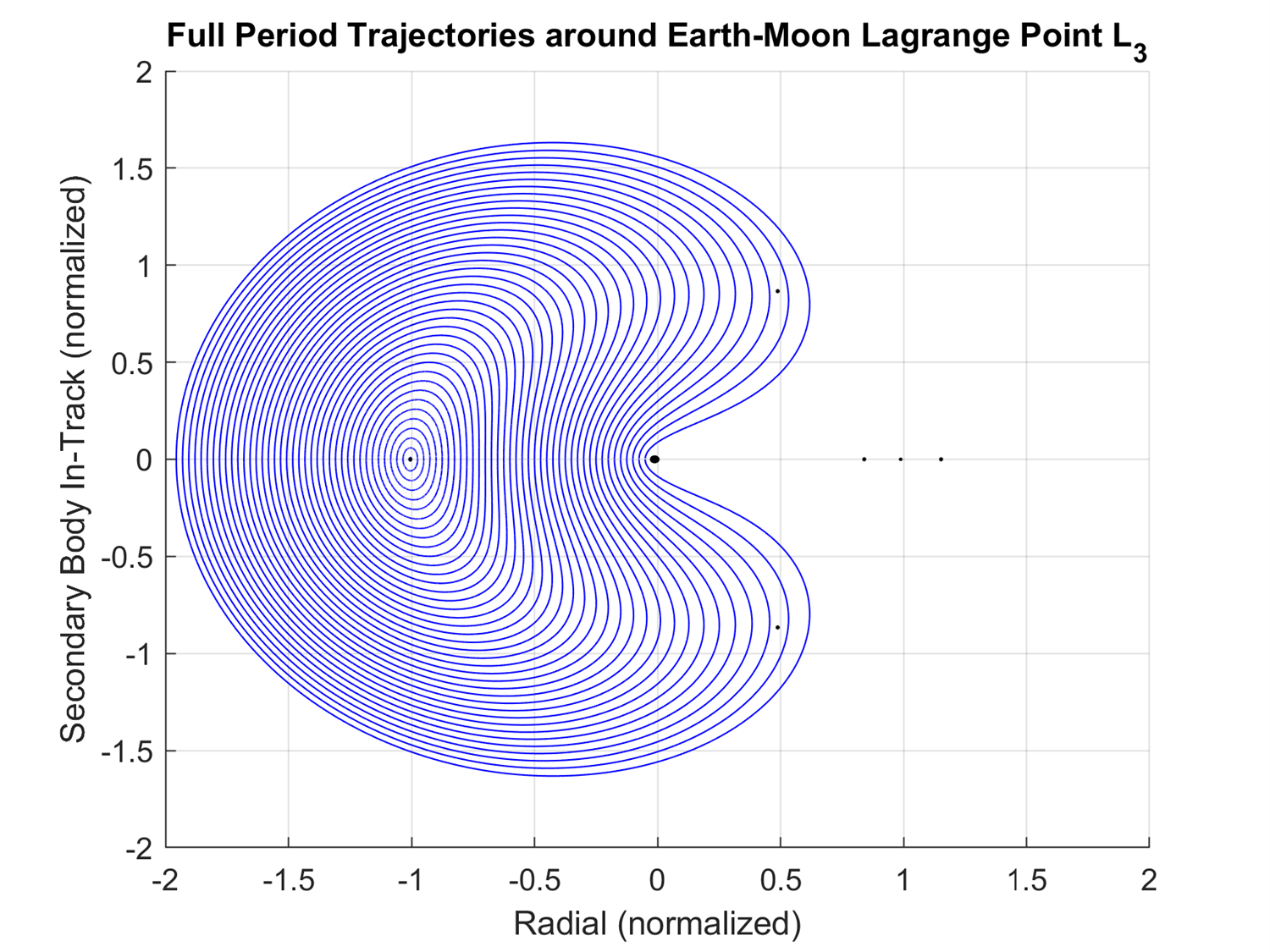 A Lyapunov orbit is a planar orbit about either L1, L2, or L3 in the radial and in-track plane. These orbits revolve around the respective Lagrange point in the clockwise direction when viewing the positive cross-track direction. Figure 7-1 shows the compilation of the Lyapunov periodic orbit about L3.