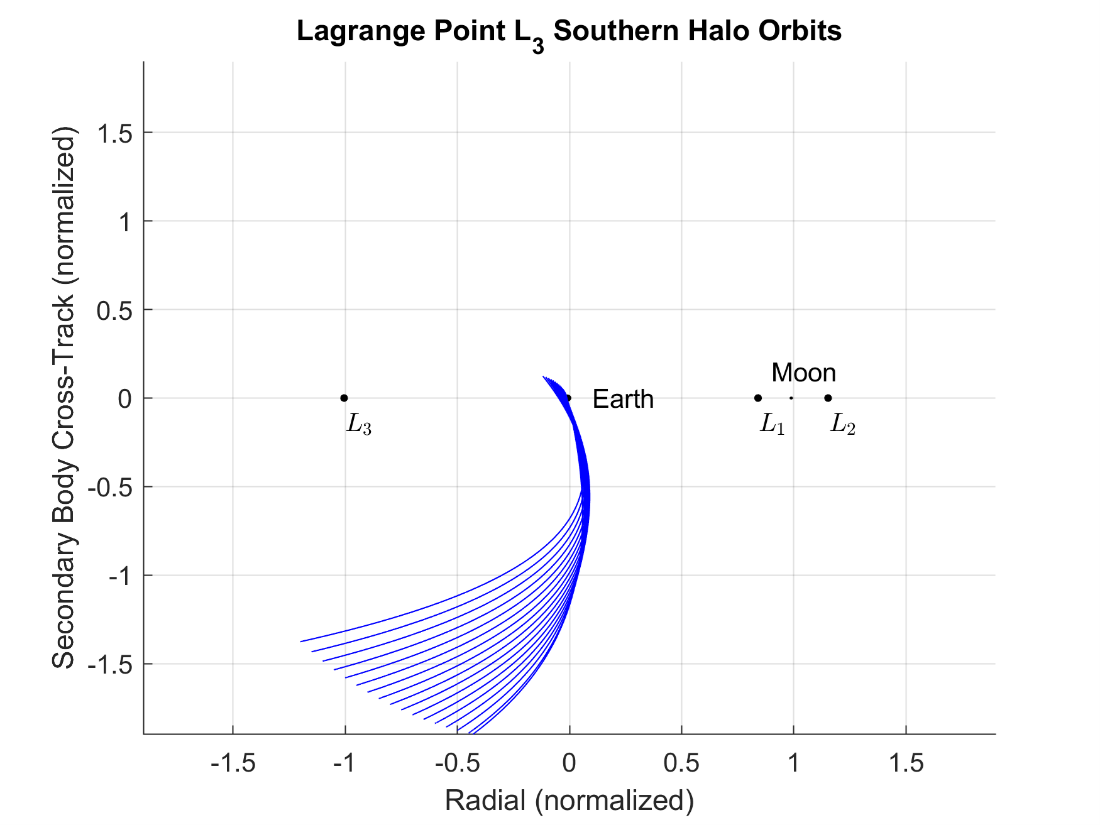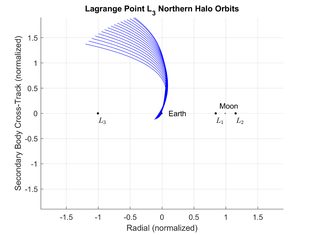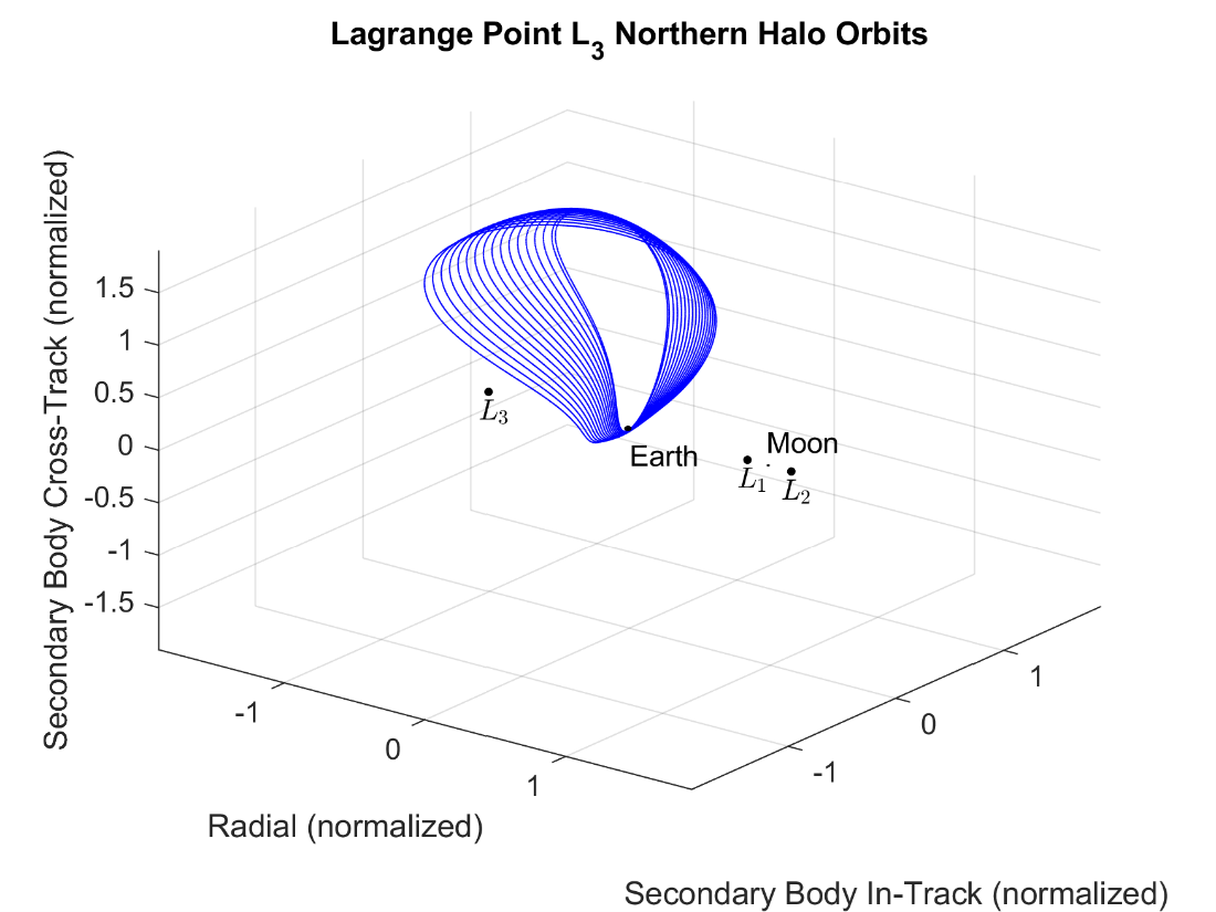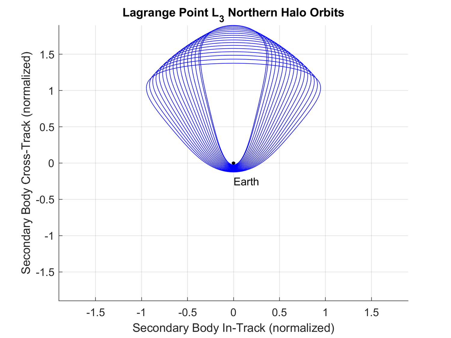 The northern halo orbits for L3 are a bit different than L1 and L2 as shown below, however, L3 still contains both a northern and southern set of halo orbits. Figure 7-3 shows the compilation of the northern halo periodic orbits with L1, L2, Earth, and the Moon labeled. Figure 7-4 shows the same compilation of the northern halo orbits about L3 but from the positive radial direction looking towards the center of the frame. Figure 7-5 shows the same compilation of the northern halo orbits about L3 but from the negative in-track direction looking towards the Earth.