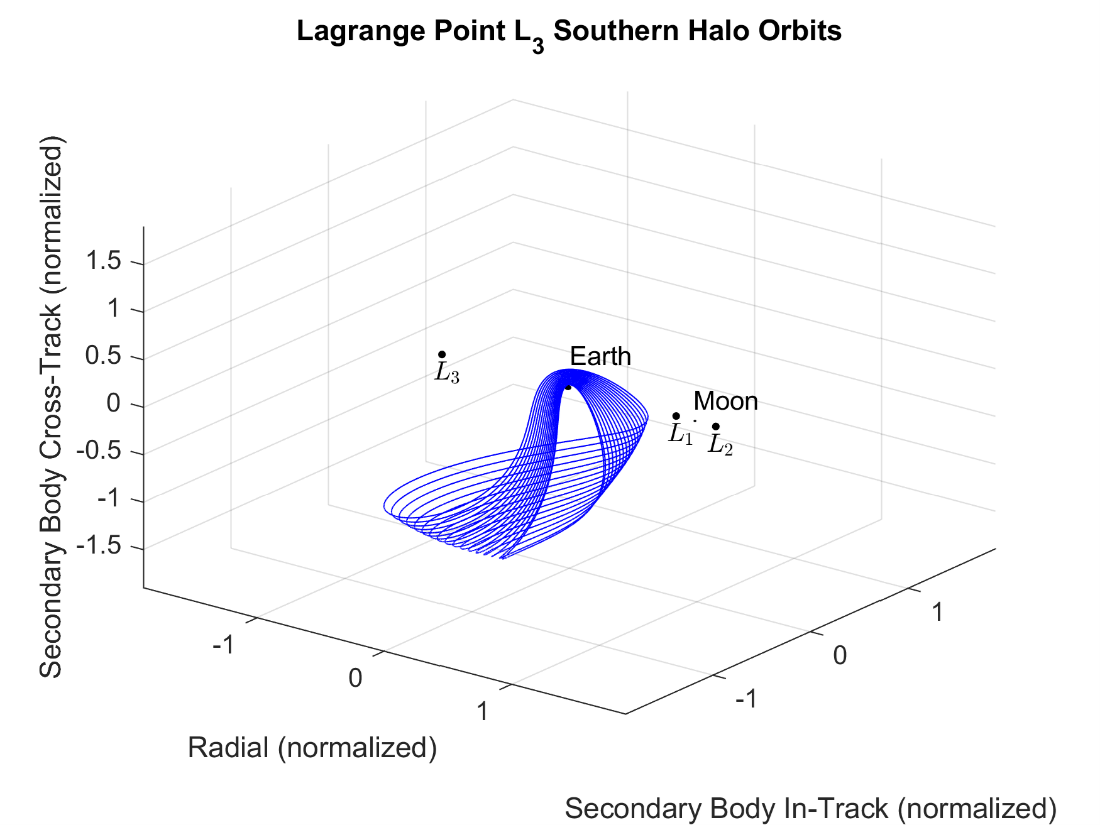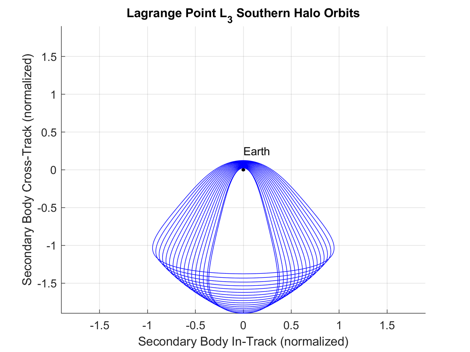 The southern halo orbits are nearly identical to the northern halo orbits for L3 except the orbits are primarily below the radial and in-track plane. The method of calculating the southern halo orbits is identical to that of the northern halo orbits shown on the STM page.